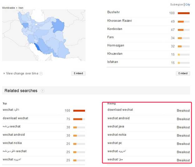آمارسنجی که در سایت گوگل شده است نشان می دهد که در ماه های اخیر کلمه "Wechat" در ایران آنچنان تعدد در جستجو داشته که آمار گوگل آن را به عنوان کلمه رکورد شکن در ایران ثبت نمودن است.