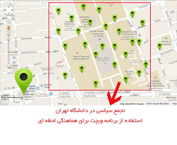 این امکان را در دانشگاه تهران در نظر بگیرید، تمامی افرادی که این برنامه را دارند داخل دانشگاه تهران می توانند همدیگر را پیدا کنند و به راحتی برای تجمع در یک مکان مشخص برنامه ریزی کنند حتی در صورتی که پراکنده شوند نیز چون این برنامه وجود دارد مجدد می توانند محل دیگری را برای تجمع انتخاب نمایند، در واقع دیگر پراکنده کردن تجمعات معنای خاصی ندارد، دست هر نفر وسیله ای است که در هر لحظه با دیگر اعضای گروهک خود می تواند در ارتباط باشد و مجدد برنامه ریزی کنند.